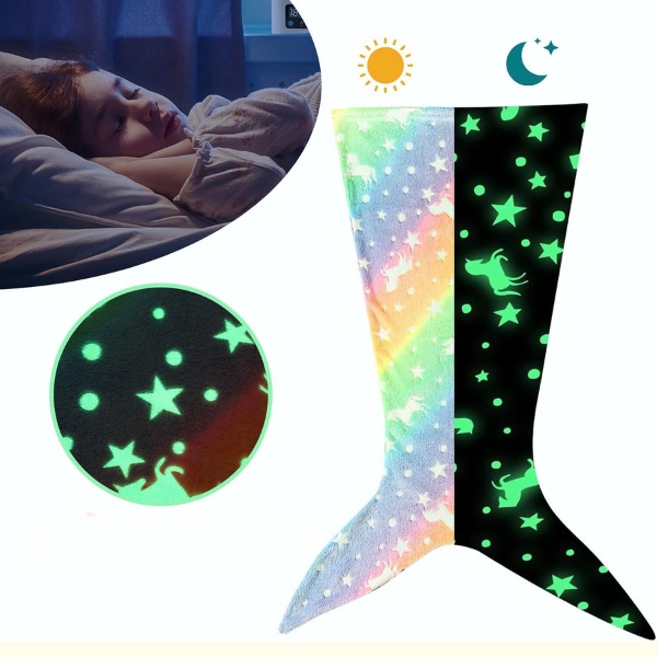 Die MERMAIDREAM-decke leuchtet im dunkeln und spendet ein beruhigendes licht, um nächtliche ängste zu lindern. Setzen sie sie einfach 20 minuten lang dem tageslicht aus, und sie leuchtet die ganze nacht. Wählen sie zwischen dem haifischschwanz- oder dem meerjungfrauenschwanz-design für zusätzliche magie, wenn ihr kind schläft.